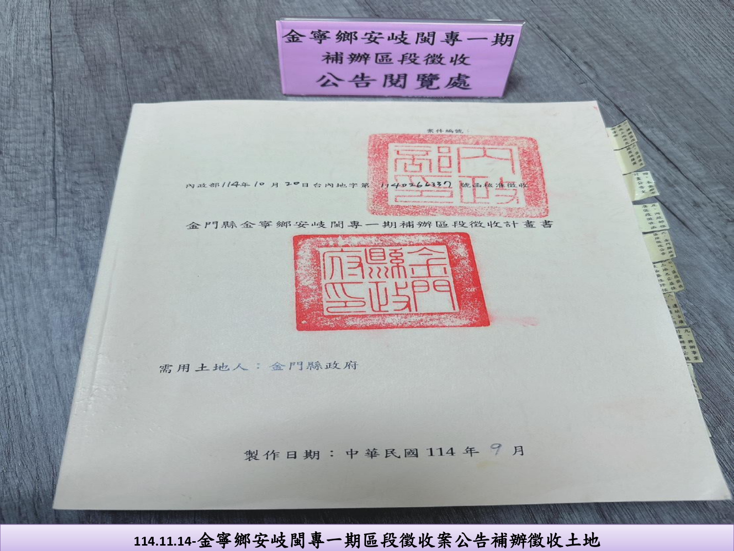 114.11.14金寧鄉安岐閩專一期區段徵收案公告補辦徵收土地-開發面積約17.76公頃。113年10月23日內政部土地徵收小組第295次會議決議,除寧湖三劃段660地號土地保留再議外,其餘土地准予區段徵收。關於660地號,本局續辦協議價購及公聽會,並於114年7月14日函報徵收計畫書,10月1日內政部土地徵收審議小組經再審查公益性及必要性等事項後,決議准予徵收;縣府114年11月14日公告補辦徵收,公告期間至12月14日止。本案未來將開闢閩南建築專用區及公共設施用地,延續閩南文化,提升土地利用價值,共同開發,創造美好未來。