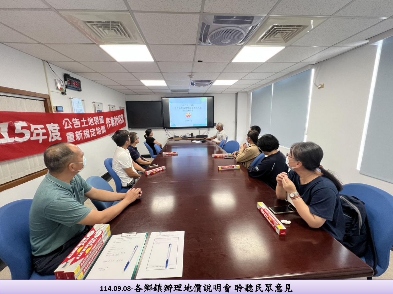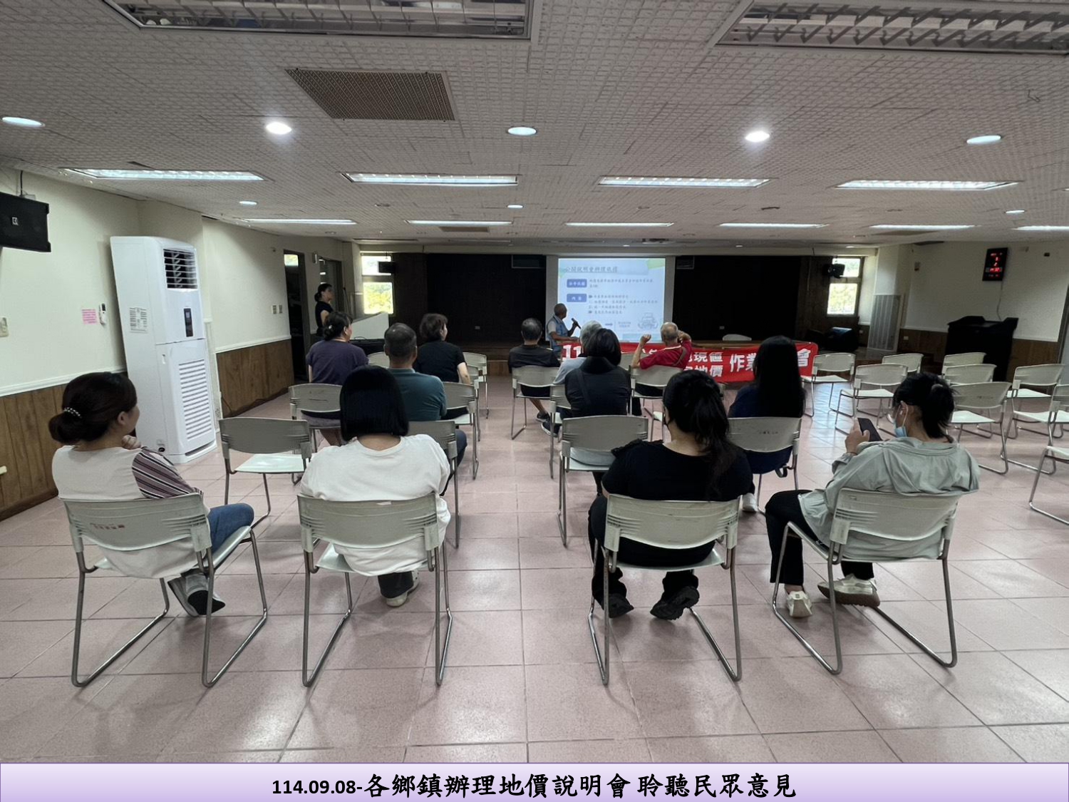 1140908各鄉鎮辦理地價說明會 聆聽民眾意見─為115年公告土地現值暨公告地價作業向各界說明本縣地價調查、區段劃分、地價估計作業情形以及最近一期地價動態分析,並聽取民眾意見彙整後提送本縣地價及標準地價評議委員會作為評議參考,同時於會中宣導不動產交易法令新訊及實價登錄等相關措施。