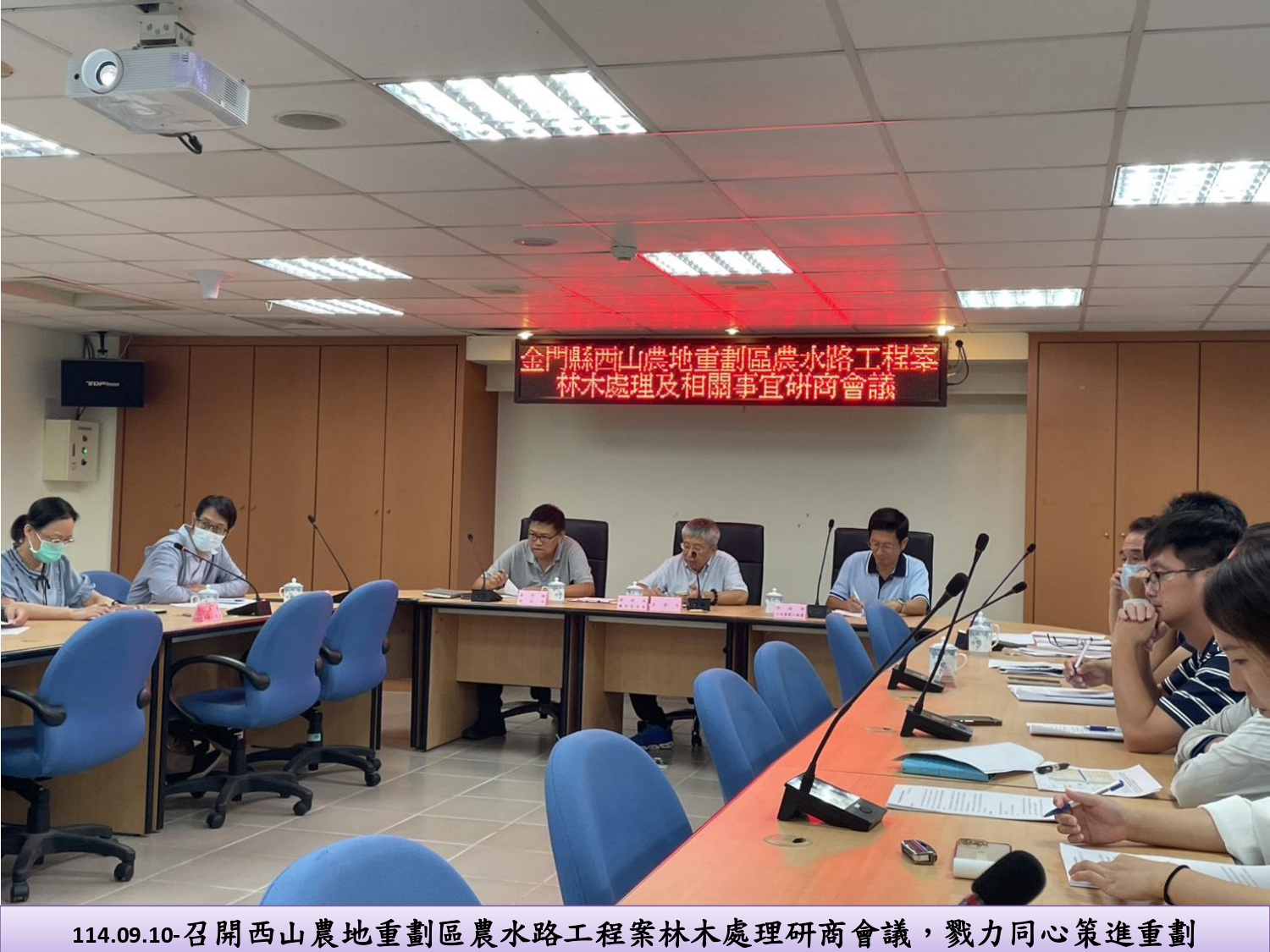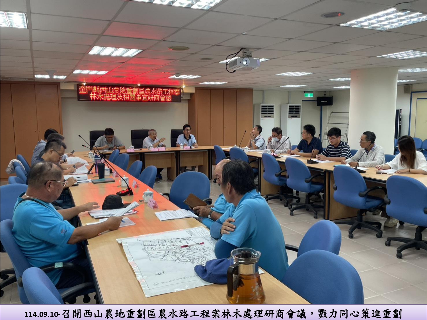 1140910召開西山農地重劃區農水路工程案林木處理研商會議,戮力同心策進重劃—西山農地重劃案總面積約58公頃,本縣戮力推動本案,施作農水路、改善農耕環境及保障農民耕作權益,地政局於114年9月10日召開農水路工程案林木處理研商會議,由局長魏志成主持,並邀請土地重劃工程處及相關單位與會,就竹木草處理總量、地上物處理策略及概算費用等進行,作為後續重劃推動依據。期透過本次會議凝聚共識,提升規劃完整度,活化土地並改善農業生產環境。