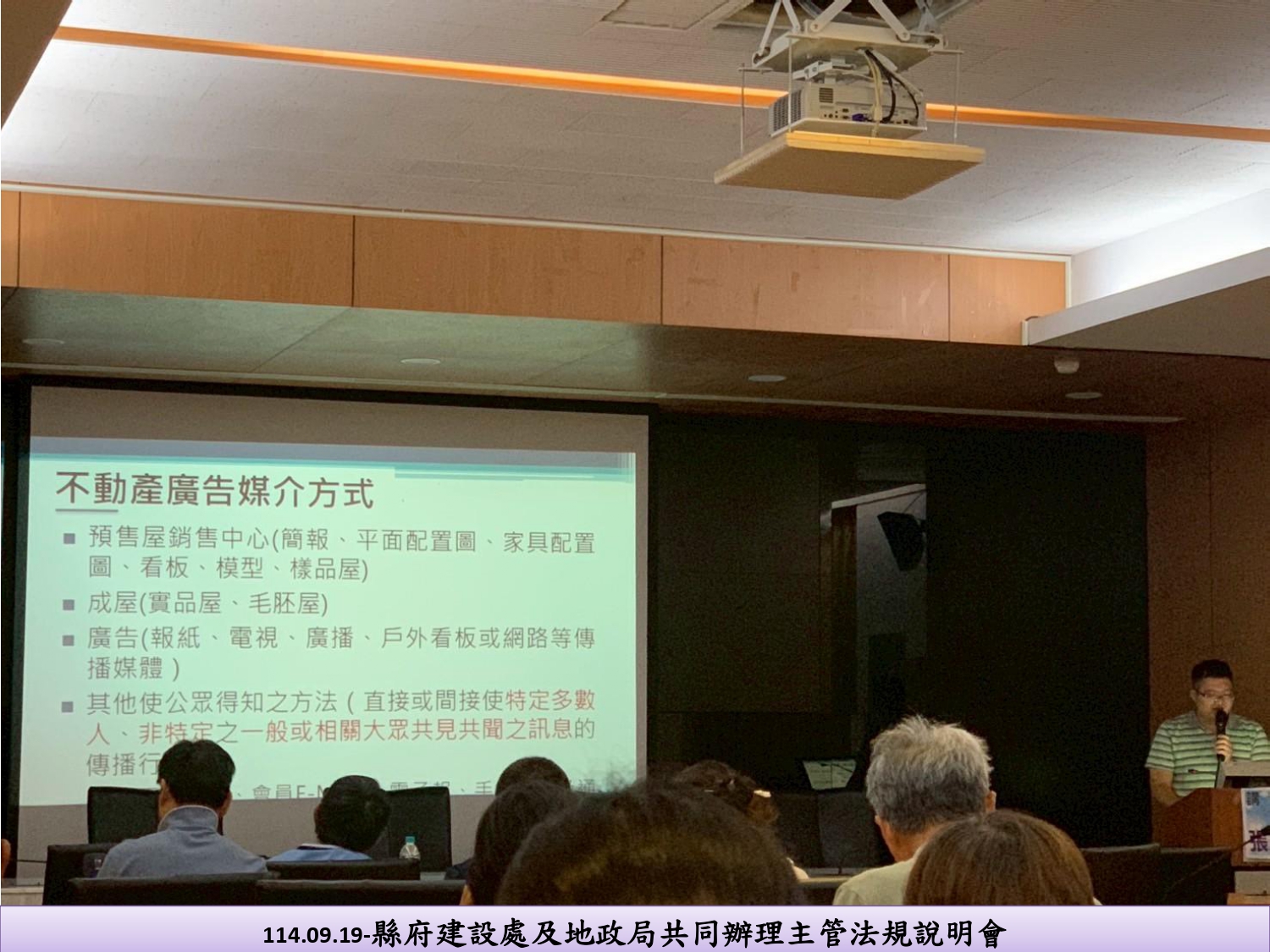 1140919縣府建設處及地政局共同辦理主管法規說明會-為協助公平交易委員會推廣法規認知,本局及建設處共同於114年9月19日辦理「主管法規說明會」。本次活動安排「不動產廣告規範宣導說明」及「不動產仲介業行為規範及實務案例」兩大課程,分別由公平會公平競爭處及中華民國消費者文教基金會主講。會中透過專業講解與案例分享,協助業者正確認識廣告規範及仲介行為準則,並與與會人員進行交流座談,氣氛熱絡。參與者普遍認為課程內容具體實用,對提升法令遵循意識及健全市場交易秩序助益良多。縣府表示,未來將持續與相關單位合作,推動不動產市場健全發展,確保消費者權益。
