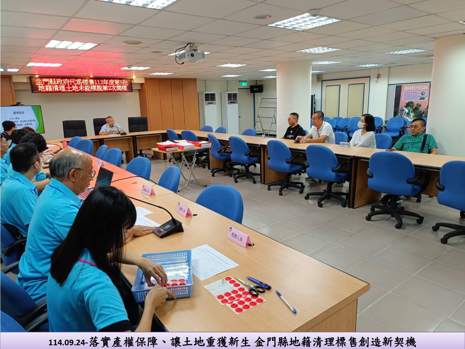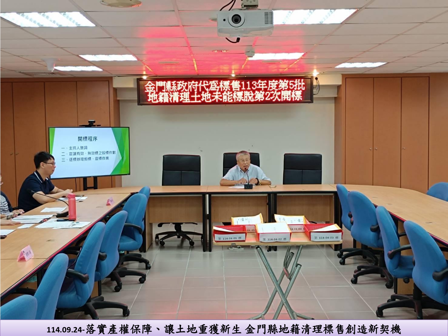 1140924落實產權保障、讓土地重獲新生 金門縣地籍清理標售創造新契機-為解決土地權屬問題,促進土地資源有效運用,金門縣政府辦理113年度第5批地籍清理未能釐清權屬土地第二次代為標售,標售標的共計5筆土地,已於114年9月24日上午開標完成。開標結果計有3筆土地標脫,總標脫金額為新臺幣8,436,753元;另2筆為無效標,擬於公告期滿後辦理囑託登記為國有。透過代為標售方式解決因權屬不明、權利人出洋、繼承複雜或共有人失聯致土地閒置等問題,兼顧優先購買權人及現使用人權益並活化土地資源。標售價金依法提存10年,保障原權利人及繼承人財產權益,並藉由多元宣導提醒民眾辦理繼承登記,以釐清產權、健全地籍管理。
